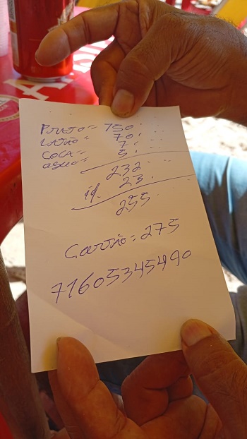 Um grupo com três pessoas voltou a enfrentar preços superfaturados. É o que revela o fotógrafo Genival Paparazzi, que estava com dois amigos. Os três consumiram um prato de camarão (R$ 150), seis cervejas latão (R$10 cada unidade), duas Coca-Colas (R$ 7 cada uma) e uma água (R$ 5). A soma daria R$ 229. Mas o preço cobrado foi R$ 255, sendo que o valor subiria para R$ 275 se fosse pago com cartão. Lembramos que o incidente com os dois turistas de Mato Grosso foi por R$ 30 cobrados a mais.