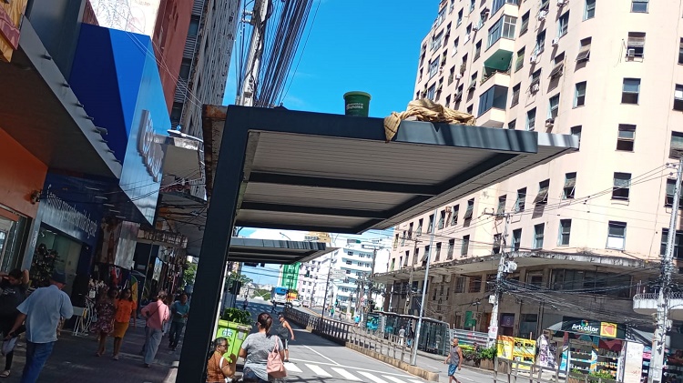 A população do Recife não toma jeito. E, pelo que se observa, as empresas, prestadoras de serviços e até órgãos públicos… também não. Como se não bastasse a bagunça das ruas do centro – calçadas indevidamente tomadas, buracos, valas, esgotos destampados – a parte superior dos abrigos de usuários do transporte coletivo da Avenida Conde da Boa vista está sendo utilizada como lixeira, ou como guarda-volumes da população em situação de rua.