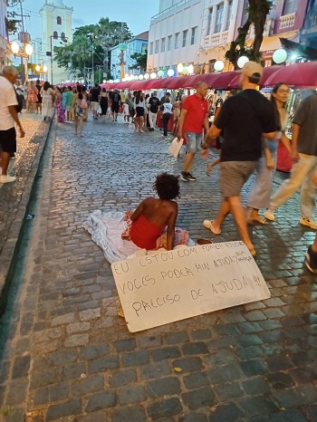 Não há dados oficiais de 2025. Na semana passada, o artista foi dar um passeio no bairro do Recife, em área turística e muito frequentada. Defrontou-se com nova cena triste, como muitas – aliás – que a gente vê pelas ruas da cidade: uma mulher, posicionada entre as barracas da feirinha dominical que ali acontece. Ela estava sentada ao chão, com um cartaz em papelão, desses que a gente costuma ver em esquinas, sinais de trânsito, cruzamentos: “Eu estou com fome”.