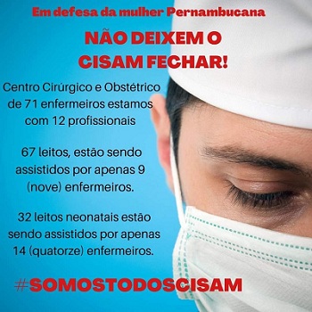 “Em defesa da mulher pernambucana, não deixem a Cisam fechar” , apela o texto divulgado no card. O post mostra os números: “Centro Cirúrgico e Obstétrico de 71 enfermeiros, estamos com 12 profissionais”. Também afirma que só há nove enfermeiros para 67 leitos. E que 32 leitos neonatais contam com apenas 14 enfermeiros. O #OxeRecife procurou Spinelli e o Conselho Regional de Enfermagem para fazer um cálculo comparativo dos números constantes no card e a demanda realmente necessária daqueles profissionais. Ambos informaram, no entanto, tratar-se de cálculo complexo, porque a demanda varia de acordo com o tipo de serviço hospitalar. Em todo caso, a necessidade para que o Cisam volte a operar , seria a contratação imediata de 38 enfermeiros e 39 técnicos de enfermagem.