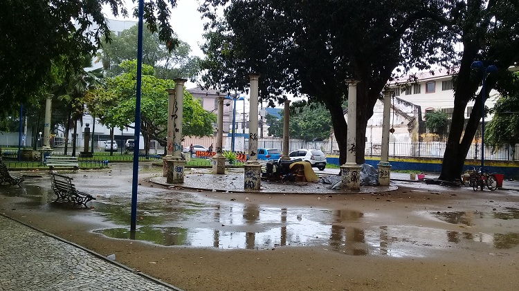 A Praça – que passou um tempo adotada pela Companhia Energética de Pernambuco (Celpe), mas nem por isso tão bem cuidada como deveria ser – está de mal a pior. Totalmente abandonada. As colunas estão pichadas, os bancos quebrados, tem lixo acumulado. E a área central virou abrigo de moradores sem teto, que ali depositam toda a sua “mobília”.