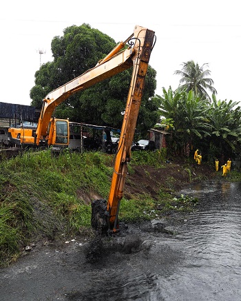 Além da limpeza do canal, o trabalho na região também conta com a atuação de um caminhão equipado com jato de sucção na Avenida Caxangá, utilizado para a desobstrução de galerias. O equipamento remove lixo, lama e realiza a sucção de águas acumuladas, ampliando a capacidade de drenagem do sistema e prevenindo pontos de alagamento. A intervenção no Canal do Cavouco, com extensão de aproximadamente 5,4 quilômetros, inclui remoção de resíduos, retirada de vegetação e desassoreamento do leito do canal, com atuação de equipes mecanizadas (foto abaixo) e manuais.