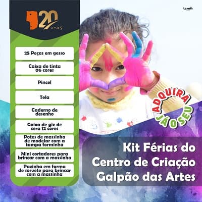 Agora, já que não é recomendável reuniões, o Galpão das Artes viu o jeito de motivar a criançada para se divertir em casa. E não é só a meninada de Limoeiro não, onde fica a sede da organização já reconhecida como ponto de cultura. A entidade está oferecendo um kit de férias com tela, tintas, caderno de desenho, caixa de lápis de cera (12 cores), potes com massa para modelar, mini cortadores de modelar, pincel, etc. O kit custa R$ 60 e a entidade entrega via sedex para qualquer parte do estado de Pernambuco. Comprar o kit não é uma forma apenas de dar ocupação para a gurizada, durante as férias. Mas também de contribuir com uma instituição com duas décadas de reconhecida atuação.