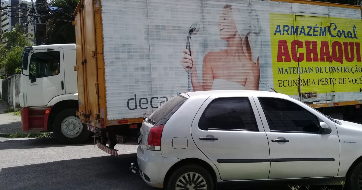 Há alguns dias, passava a pé pela Rua Jerônimo de Albuquerque, em Casa Forte, quando vi uma cena inusitada. Um caminhão “enganchado” na esquina daquela via com a Dona Rita de Souza), porque havia um carro e um caminhão parados, nos lados opostos da esquina da primeira com a segunda, como vocês podem ver na foto acima. Pense no desespero do motorista do meio, para manobrar naquele espaço… Nesta semana, passei lá de novo, e vi, outra vez, carros estacionados no mesmo local, o que configura desrespeito ao Código Nacional de Trânsito. Hoje, de novo. Ainda bem que, pelo menos nessa terça, não tinha caminhão ou ônibus querendo entrar. Na rua onde resido, que não tem saída, já houve várias vezes em que fui impedida de entrar na garagem de minha casa. Motivo: um “dono da rua” estaciona exatamente no meio da via, impedindo por completo o direito de ir e vir dos moradores.