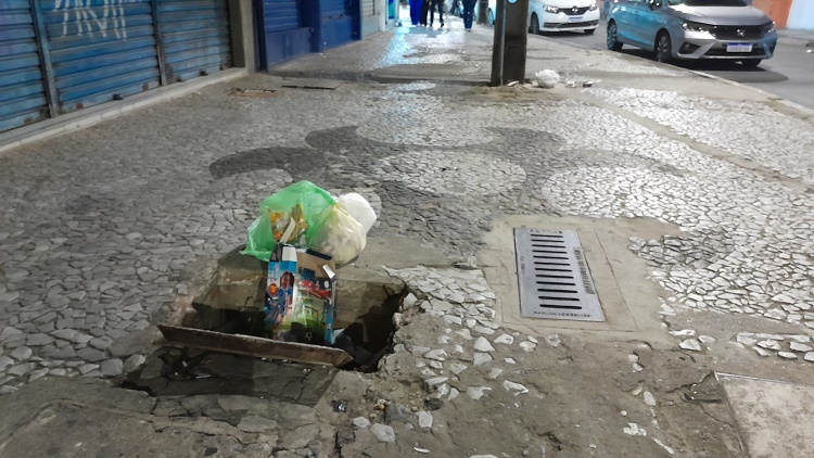 No final de 2025, enquanto aguardava a abertura dos portões, assisti vários acidentes nessa buraqueira na calçada do Hospício. Na sexta, não vi pois quando cheguei os portões já estavam abertos. Mas devem ter ocorrido, pois o perigo é iminente. Como se não bastassem as calçadas mal cuidadas, prédios sujos, no outro lado da rua vi montanhas de lixo nos canteiros das raízes centenárias que ajudam a quebrar a monotonia da paisagem tomada de asfalto e edifícios: metralhas, restos de comida, caixas, descartes de todo jeito. Uma imundície.
