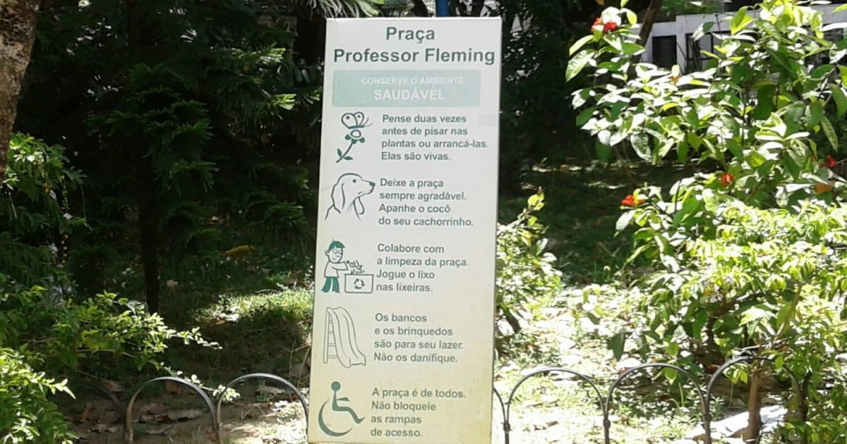 Na Praça, por iniciativa dos moradores, foi colocada uma placa, com conselhos para que os frequentadores conservem o “ambiente saudável”. Normas que deveriam ser espontaneamente seguidas pela população. Mas como a nossa cidadania deixa muito a desejar, vamos aos conselhos ali colocados, que deveriam ser seguidos por todos nós, em ruas, parques e praças. “Pense duas vezes antes de pisar nas plantas ou arrancá-las, Elas são vivas”.
