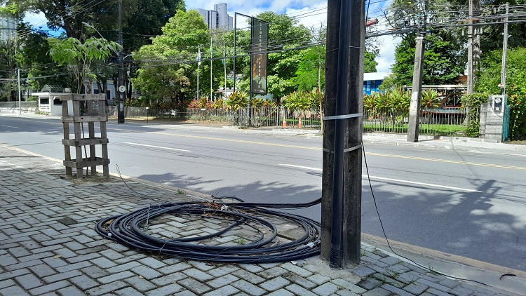 Não sabemos de que empresas são os fios, mas se são de operadorasde telefonia, a quem pertence os postes em que eles se apoiam? Realmente, alguma coisa está faltando para melhorar a prestação de serviços da Neonergia e a fiscalização dessa bagaceira da fiação elétrica aérea na cidade. Há alguns anos, um macaquinho morreu eletrocutado em um fio, em frente à minha casa. Claro que não me atrevi a tirar o cadáver, nem que fosse com uma vara de madeira, pois – como diz o ditado – “seguro morreu de velho”. E com eletricidade não se brinca. A Neonergia veio rapidamente. Não posso reclamar de demora no atendimento. As equipes retiraram logo o animal. Mas quando fui sair de casa, tomei um susto. Haviam deixado o “defunto” na porta, praticamente sob meus pés. Da mesma forma que deixaram, agora, galhos ameaçando cair nas pessoas e fios pendurados e espalhados pelo chão. Será que na Espanha é assim também, ou aqui operam dessa forma por achar que nossa cidade é a casa da Mãe Joana?
