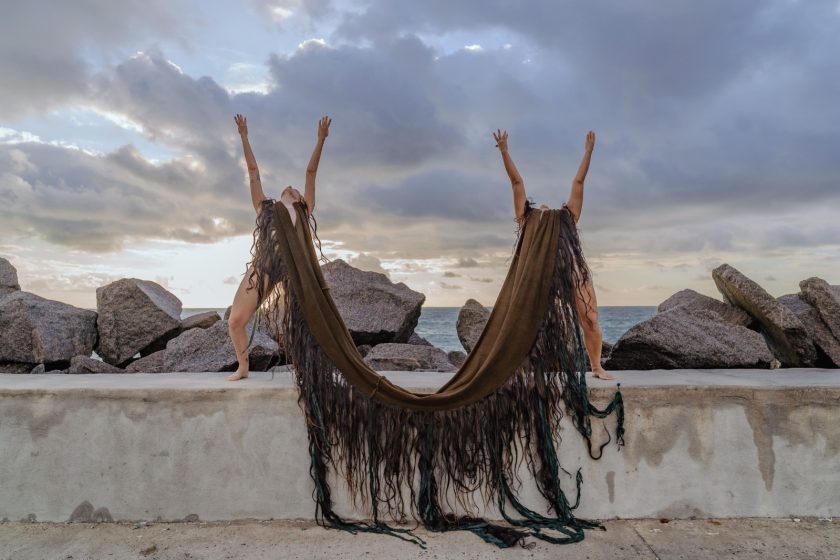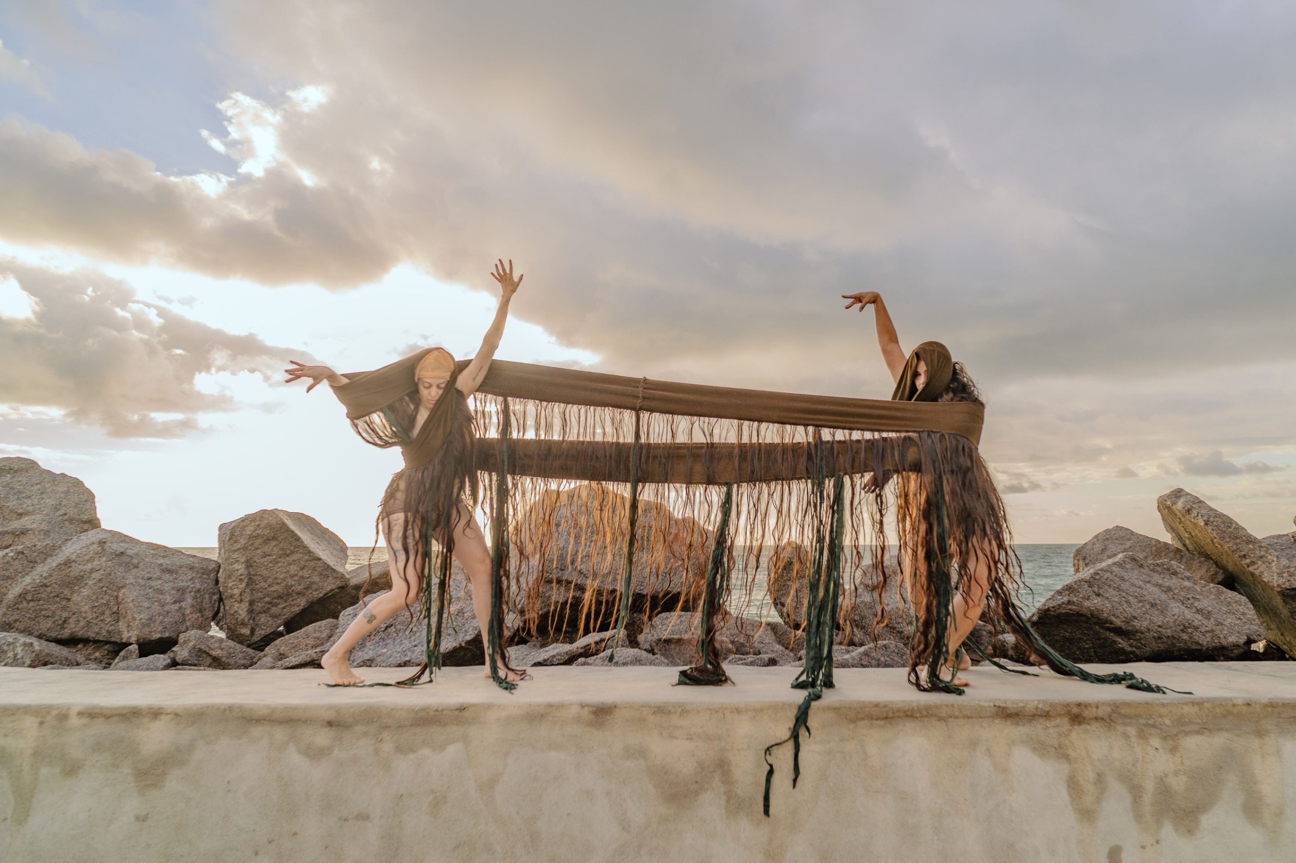 As dançarinas se inspiraram em autores como Donna Haraway, Ailton Krenak, Rufino e Luiz Antônio Simas, para criar uma experiência sensorial que entrelaça saberes, afetos, história e ecologia. No palco, elas se movem envoltas em um grande tecido sargaço que, em alguns momentos, lembra uma rede doméstica. De outras, uma rede de pesca. Também se confunde com a vegetação tão comum ao mar e à beira da praia. O processo criativo envolveu vários aprendizados da Oficina “Corpo ambiente em fluxo e suas ecologias afetivas”, ministrada por Gabi Holanda.
