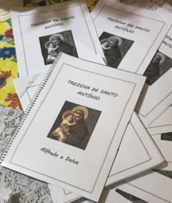 Tanto lá quanto em Salvador, quanto no Recife a ladainha é sempre rezada em latim: Christe eleison/ Christe audi nos/ Christe exaudi nos/ Pater de Caelis, Deus /Miseré em nobis/ Fili, redemptor mundi, Deus/ Miseré em nobis/ Spiritus Sancte, Deus. Mas em Salvador, as famílias preparam livretos (foto à direita), para distribuir aos visitantes, com todas as orações. Nos encontros para rezas, pães são distribuídos. Ou seja, além da “obrigação” de arranjar maridos ou esposas para pessoas que precisam de companhia – é tido como santo casamenteiro – ele ainda tem de garantir fartura para quem o cultua. Fernando me envia fotos e vídeo da trezena de Santo Antônio, no prédio em que está residindo, no bairro do Garcia, em Salvador, onde as trezenas reúnem vizinhos todas as noites de junho.