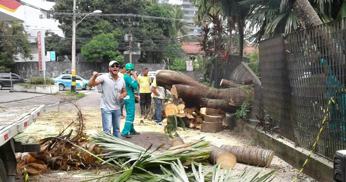 Quando passei lá, pela manhã, a mobilização era grande, com equipes da Emlurb removendo os restos mortais da árvore, que ainda está sem reposição. O Centro pertence à Prefeitura do Recife, a quem oficialmente cabe a responsabilidade pela arborização da cidade. Inclusive a manutenção e a reposição das nossas árvores.