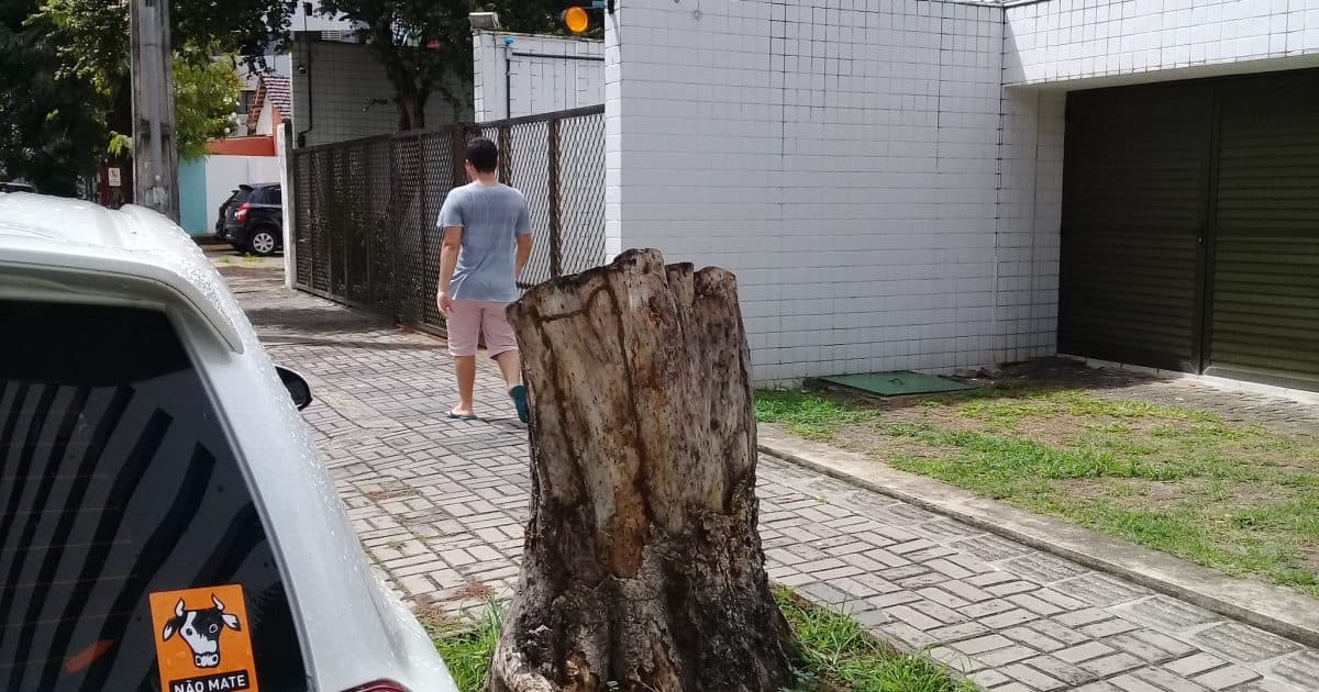 A fotografia publicada no JC me foi enviada, também via WhatsApp por uma amiga, tão amante da natureza quanto eu, para reforçar o inventário de árvores assassinadas do Recife, aqui no Blog. Na minha caminhada matinal de hoje passei no local. Na primeira vez andei toda a Rua Xavier Marques, nas Graças, e não vi o tamborete. Achei que tinha sido removido pela Emlurb para reposição.