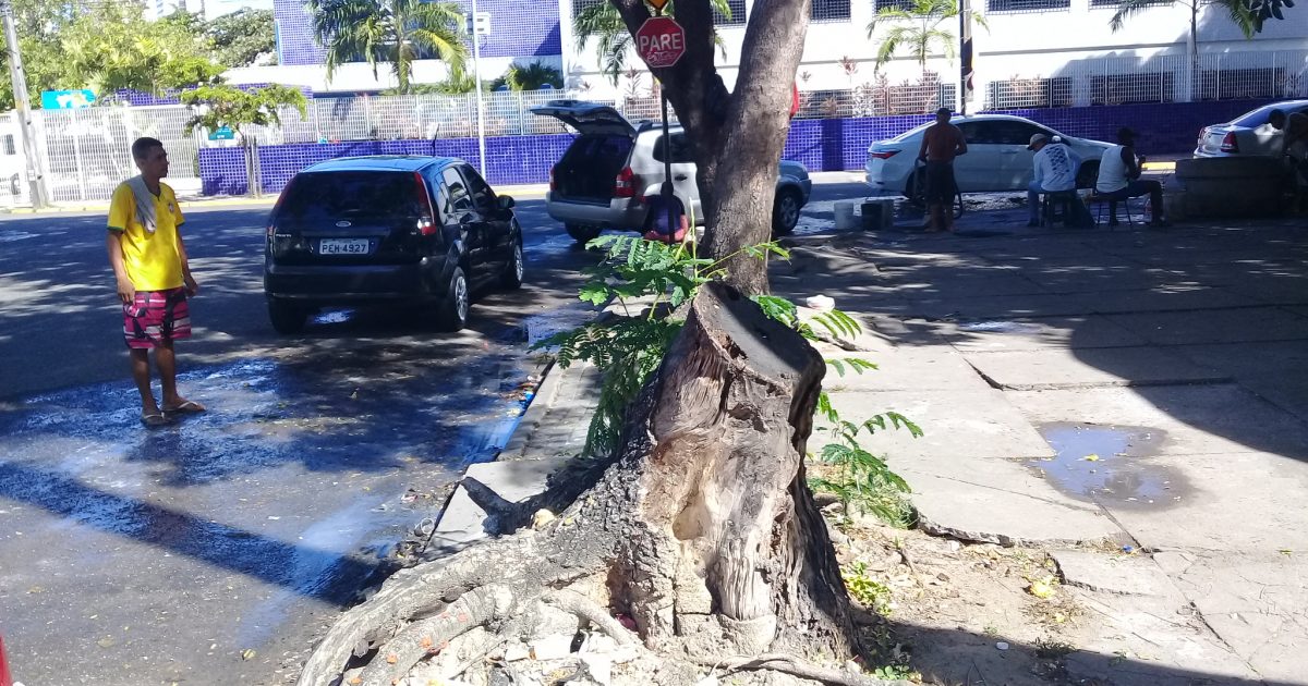 Reposição, no entanto, não podemos dizer de uma outra vítima de arboricídio com a qual me defrontei logo ao chegar ao local. Ao lado de uma lama fétida que corria rente ao meio fio da Praça do Campo Santo, me deparei com mais uma cena provocada pela motosserra insana, como vocês podem observar na foto que abre o post. É impressionante como essa paisagem está ficando cada vez mais banal na nossa cidade. Uma tristeza! Além do toco degolado em “exposição”, nada foi plantado na mesma área para compensar a sua morte.