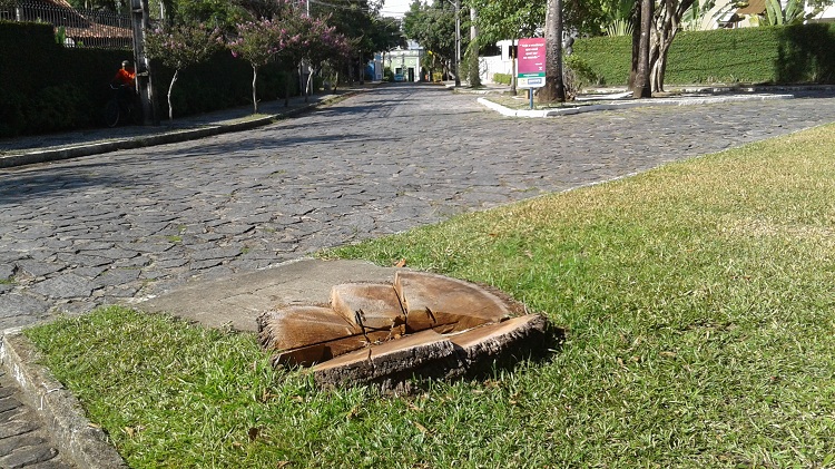 Árvores em áreas públicas são de responsabilidade do poder público: manutenção, poda, corte, fiscalização. No Poço, eram duas palmeiras imperais. Imponentes, inclusive. Mas de acordo com o trabalhador do imóvel, as palmeiras foram atacadas por um besouro e ameaçavam cair, motivo pelo qual foi solicitado o corte. Claro, se há risco de desabar o corte deve ser efetuado para preservar vidas humanas. O problema é que, com o corte, deve ser feito o destocamento, como é chamada a retirada dos tocos que sobram dos caules das árvores degoladas.