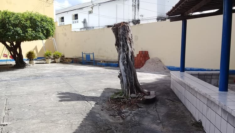 No Recife, se destrói o verde para implantar áreas… verdes, como ocorreu recentemente no bairro das Graças. O tronco degolado continua colado em um poste. Não houve destocamento, nem reposição da árvore indevidamente sacrificada. Já no caso do Colégio Marillac, um funcionário informou ao #OxeRecife que a degola foi motivada pela insegurança da árvore, que estava para cair, podendo provocar acidente entre alunos, professores e funcionários. Só que esqueceram de plantaram outra no lugar.