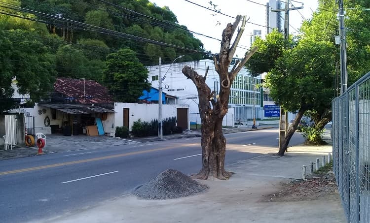 Porém, a comunidade ou mesmo os órgãos públicos não vêm contribuindo para a melhoria da situação do patrimônio verde do bairro. A cada dia, aparece um toco, uma árvore mutilada, ou derrubada. Essa fica na Avenida Dezessete de Agosto, em frente a uma agência de automóveis, vizinha ao número 455. A loja estava fechada e os vizinhos não souberam informar se a “poda” , a ação da motosserra insana partiu de órgãos oficiais ou particulares. E haja arboricídio!
