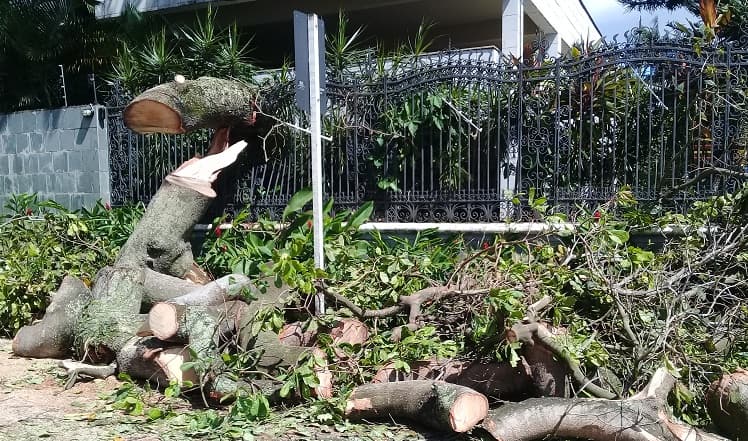 A árvore caiu com toda força, por cima do muro, chegando a retorcer suas grades de ferro. Ela era tão alta que, ao arriar, obstruiu toda a via. Foi preciso chamar os órgãos oficiais, para fazer a desobstrução. Uma pena, quando uma árvore cai. Mas a gente se conforma. Mas a remoção completa ainda não ocorreu e as duas calçadas da via estavam completamente tomadas por “postas” de tronco, galhos, folhagens.