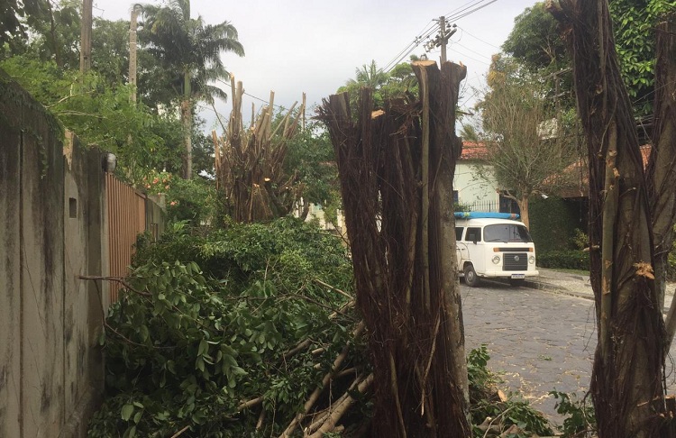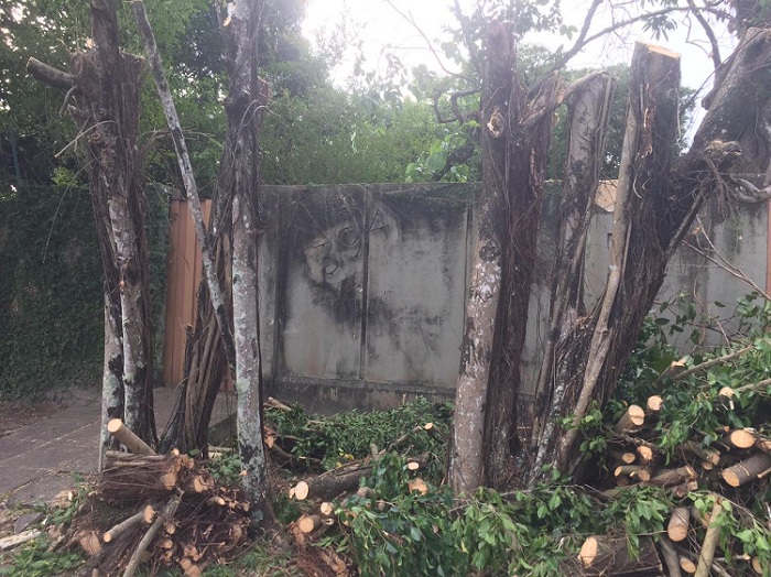 Na verdade, nenhuma árvore foi totalmente derrubada. Mas são seis que ficaram totalmente peladas. Duas mangueiras ficam em área interna. Quatro outras, estão sem galhos nem folhas, na calçada do imóvel 394. Uma tristeza, mas é assim. Sem as copas das árvores, o conforto térmico se reduz, claro.