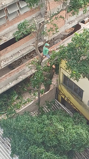 Não são poucos os homens que, com varas e empurrando carros de mão, operam a colheita e depois vendem os frutos em ruas e feiras. Pois menos de um mês após a invasão do bandido, a planta foi vítima de um cruel arboricídio, como vocês podem ver abaixo. Pior, o homem contratado para acabar com a árvore, nem equipamento de segurança tinha conforme pode se observar nas fotos.