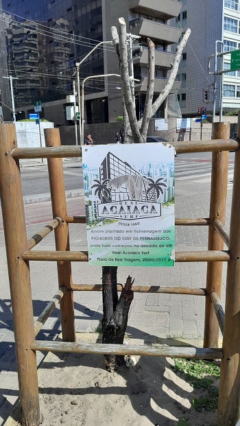 Já o “clube” dos surfistas foi fundado em 1960. E a placa no cercadinho daquilo que a árvore foi um dia, avisa a que veio a árvore. Uma forma de marcar um esporte. “Árvore plantada em homenagem aos pioneiros do surf de Pernambuco, onde tudo começou na década de 1960”. A árvore foi ali colocada em 20 de junho de 2019. Mas dela, pelo que se vê, só vai sobrar a lembrança. Assim como a dos surfistas sobre as ondas do mar…