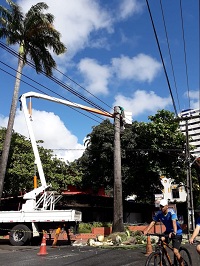 As duas plantas ornamentavam a calçada do Bar Real. E os restos mortais não foram removidos para posterior reposição. Como ficam em área pública, a responsabilidade pela manutenção, poda, erradicação e reposição é da Prefeitura. E se a guilhotina foi feita por particular, o autor da derrubada pode ser multado, como ocorreu no ano passado, com o caso de uma mangueira no Rosarinho, que foi assassinada com injeções de veneno por uma empresa. Tomei conhecimento da segunda degola no final de semana, através de grupos do WhatsApp da Zona Norte do Recife, onde resido. No sábado, vi as postagens em que um caminhão girafa era utilizado, para remover parte da palmeira (foto ao lado). “Sabem porque estão cortando a palmeira, na frente do Bar Real? Tem outra do lado ainda. Daria para salvar?”, comentam os moradores.
