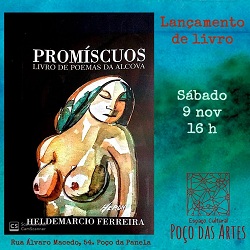 A Esquina do Blues é formada pelos músicos Marcelo Demo, Bira Batera, Thales Silveira e Euclides Dourado, figuras conhecidas pelo trânsito entre o blues e o jazz. No sábado (9/11), no mesmo local, a partir das 16h tem o lançamento de Promíscuos – Livro de Poemas da Alcova, de Helder Marcio Ferreira (foto ao lado). E a partir das 20h30m, tem show com Sõnia Sinimbu. A artista será acompanhada por Breno Lira (violão) e e Tomas Melo (percussão). Sônia interpretará o repertório de Mercedes Soza (1935-2009), cantora argentina, uma das mais famosas da sua época na América Latina, que ficou conhecida a voz dos que não tinham voz.