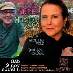 Sônia já esteve anteriormente no Poço das Artes, sempre interpretando Mercedes Soza. Dessa vez, ela tem como convidado o cantor Geraldo Maia (ao lado). A apresentação tem início às 20h30m, e o couvert custa R$ 20 (em espécie). No domingo (10), o Festival do Circo do Brasil chega ao Poço da Panela. E por esse motivo, o Poço das Artes abre em caráter extraordinário, a partir das 16h. “O Poço das Artes é o melhor lugar para comer, bebericar e repor as energias”, avisa Clarissa Garcia, idealizadora do Poço das Artes, que já se transformou em point da turma da Zona Norte que tem bom gosto musical. A Rua Álvaro Macedo é aquela em cuja esquina fica a icônica Venda de Seu Vital.