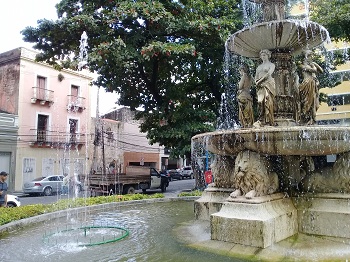 Já são muitas, as oportunidades em que passo pela Praça Maciel Pinheiro, seja com grupos como Caminhadas Culturais, Caminhadas Domingueiras ou Projeto Olha! Recife. Ou mesmo quando tenho alguma coisa a resolver ali perto. E a degradação, infelizmente, é cada vez maior. Basta dizer que apenas uma vez tive oportunidade de ver a fonte funcionando (foto), que é quando ela fica mais bonita. Mas suas ninfas, máscaras e leões esculpidos em pedra estão a seco, sempre. É raro ver a fonte jorrando. Infelizmente.