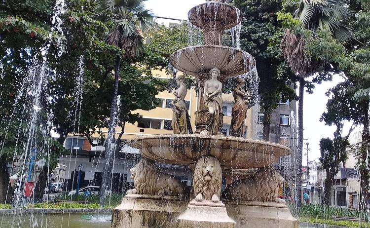 Já são muitas, as oportunidades em que passo pela Praça Maciel Pinheiro, seja com grupos como Caminhadas Culturais, Caminhadas Domingueiras ou Projeto Olha! Recife. Ou mesmo quando tenho alguma coisa a resolver ali perto. E a degradação, infelizmente, é cada vez maior. Basta dizer que apenas uma vez tive oportunidade de ver a fonte funcionando (foto), que é quando ela fica mais bonita. Mas suas ninfas, máscaras e leões esculpidos em pedra estão a seco, sempre. É raro ver a fonte jorrando. Infelizmente.