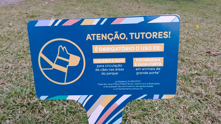 Fui olhar a “placa” referida pela tutora para conferir, enquanto a moça segurava o animal rapidamente pela coleira, embora ele esbravejasse para o meu lado. A placa é evasiva. “Atenção, tutores! É obrigatório o uso de coleira e guia para circulação nas áreas do parque”. E “focinheira e guia curta em animais de grande porte”.