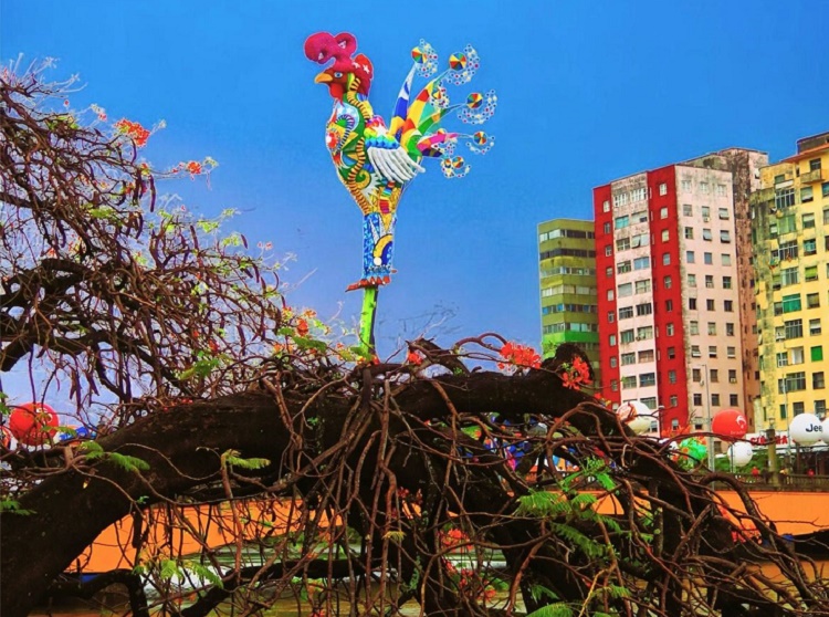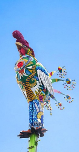 Em 2026, não foi diferente. Ele tirou uma manhã de céu azul, para guardar a imagem da grande escultura idealizada por Leopoldo Nóbrega, artista que tem um grande diferencial em relação aos que o antecederam na missão. Nóbrega tem um pé na arte e outro na sustentabilidade e na questão social. A alegoria de 2026, por exemplo, foi confeccionada quase integralmente com materiais recicláveis que poderiam ter ido para o lixo, e estar poluindo a natureza. E a confecção contou com a ajuda de idosos, associações de bairro e até pacientes atendidos nas unidades do CRAS (Centro de Referência de Assistência Social). E Galo de 2026 também veio com uma mensagem de paz e inclusão social. Independente dos seus significados, está lindo e pode ser visto até o dia 21 de fevereiro, quando começará o seu desmonte. O que ninguém entende – nem eu nem a população e os foliões – é porque essa monumental obra de arte só é visível à luz do dia. Pois à exceção da noite da cerimônia da subida – iluminada por refletores oficiais e de emissoras de TV para transmissões ao vivo – o Galo ficou às escuras por todo o carnaval. O que é uma pena. E não deveria ser assim. Como é gigante, pode ser melhor admirado.