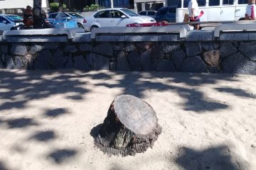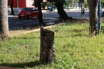 Estão vendo essa mancha cinzenta, aí nessa calçada? Neste lugar tinha uma árvore, que sofreu um processo de degola. Ficaram…