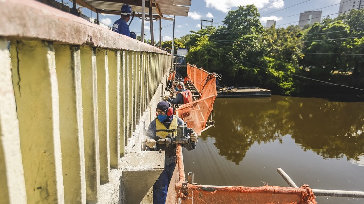 No caso da Ponte do Derby e Torre – que são muito parecidas e tinham problemas similares – estão sendo feitos: recuperação dos tubulões, das travessas, transversinas e do tabuleiro, substituição dos apoios, através de macaqueamento hidráulico, e a pintura de proteção em todo serviço realizado. Só o conserto da Ponte do Derby custará R$ 5.5 milhões. Nela, há 45 profissionais em atividade e já foram executados os trabalhos relacionados a 33% das fundações e 60% da superestrutura. Ops….
